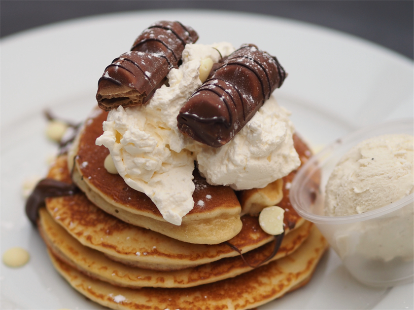 *NEW* American-style pancake stack with Cadbury Freddo, milk chocolate sauce, chocolate shavings, whipped cream, vanilla ice cream