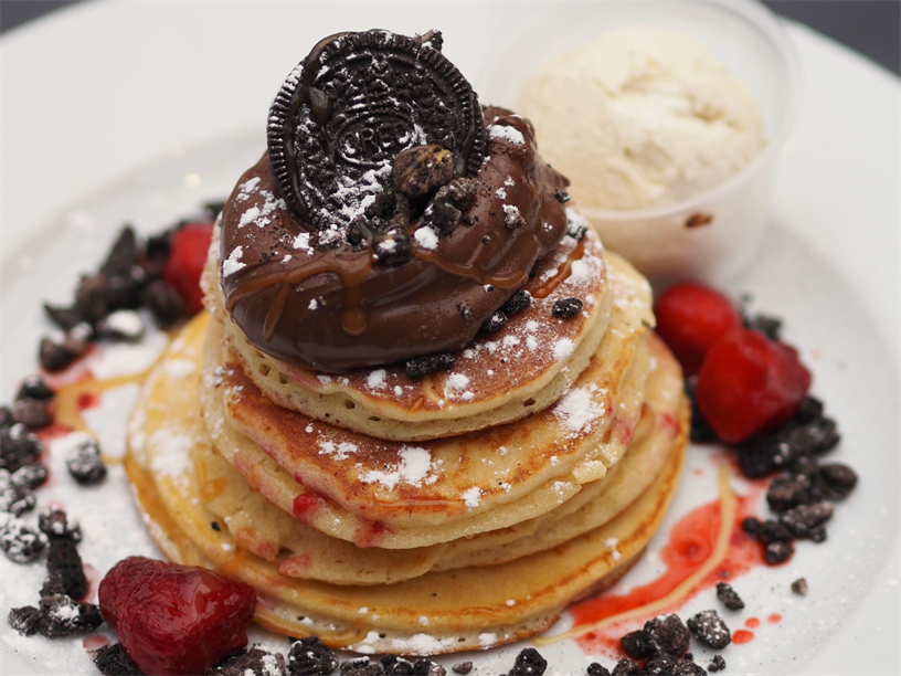 *NEW* American-style pancake stack with Nutella, strawberry compote, Oreo pieces, whipped cream, vanilla ice cream